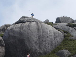 | 永田岳の巨岩に立つ | ||
