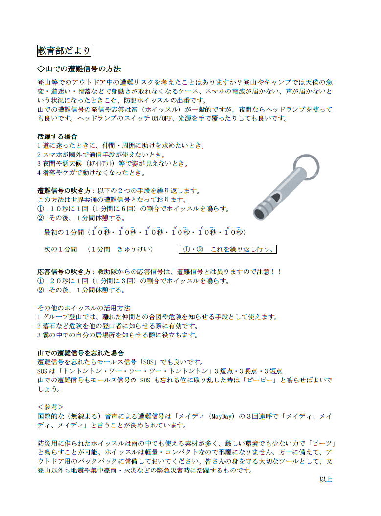 | 内 容 | 1.山でのケガ等の対応・救急訓練 ※実習がありますので、動きやすい服装で 2・昼食 3.読図(GPS解説等) 4.無線教室 5.テーピング 6.腰痛予防のビデオ観賞 7.質問タイム |