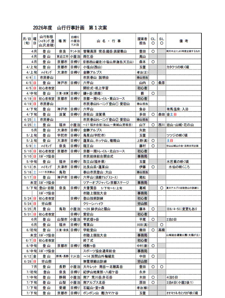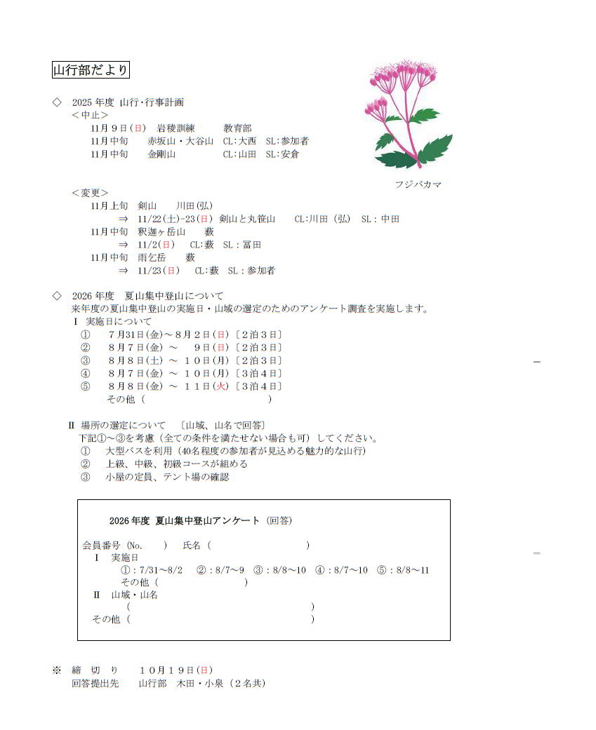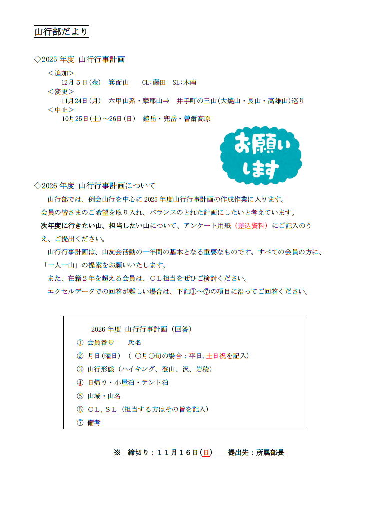山行担当者は山行届・下山報告・山行報告書を山行部長
